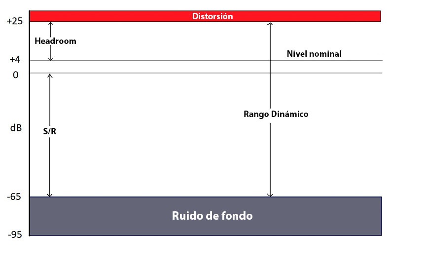El entorno analógico tiene 5 etapas de rango dinámico: ruido de fondo, relación señal ruido, nivel nominal o de referencia, headroom y distorsión. A continuación, vamos a explicar cada una ellas para que lo entiendas a la perfección.