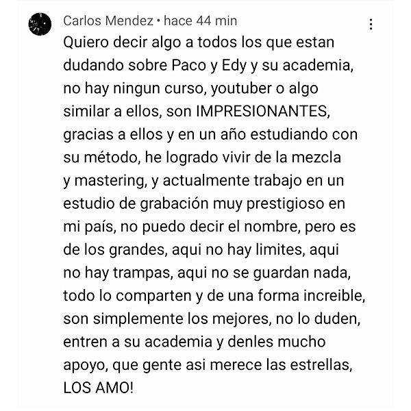 Al igual que Carlos, un antiguo alumno que gracias a nuestro Método ha logrado trabajo en uno de los mejores estudios de su país (tienes su caso en la sección de testimonios), tú también aprenderás técnicas avanzadas para analizar cualquier canción de cualquier estilo musical y transformar tus sonidos hasta alcanzar la misma potencia, claridad y definición (existen analizadores para PC y Mac, VST/AU excelentes).